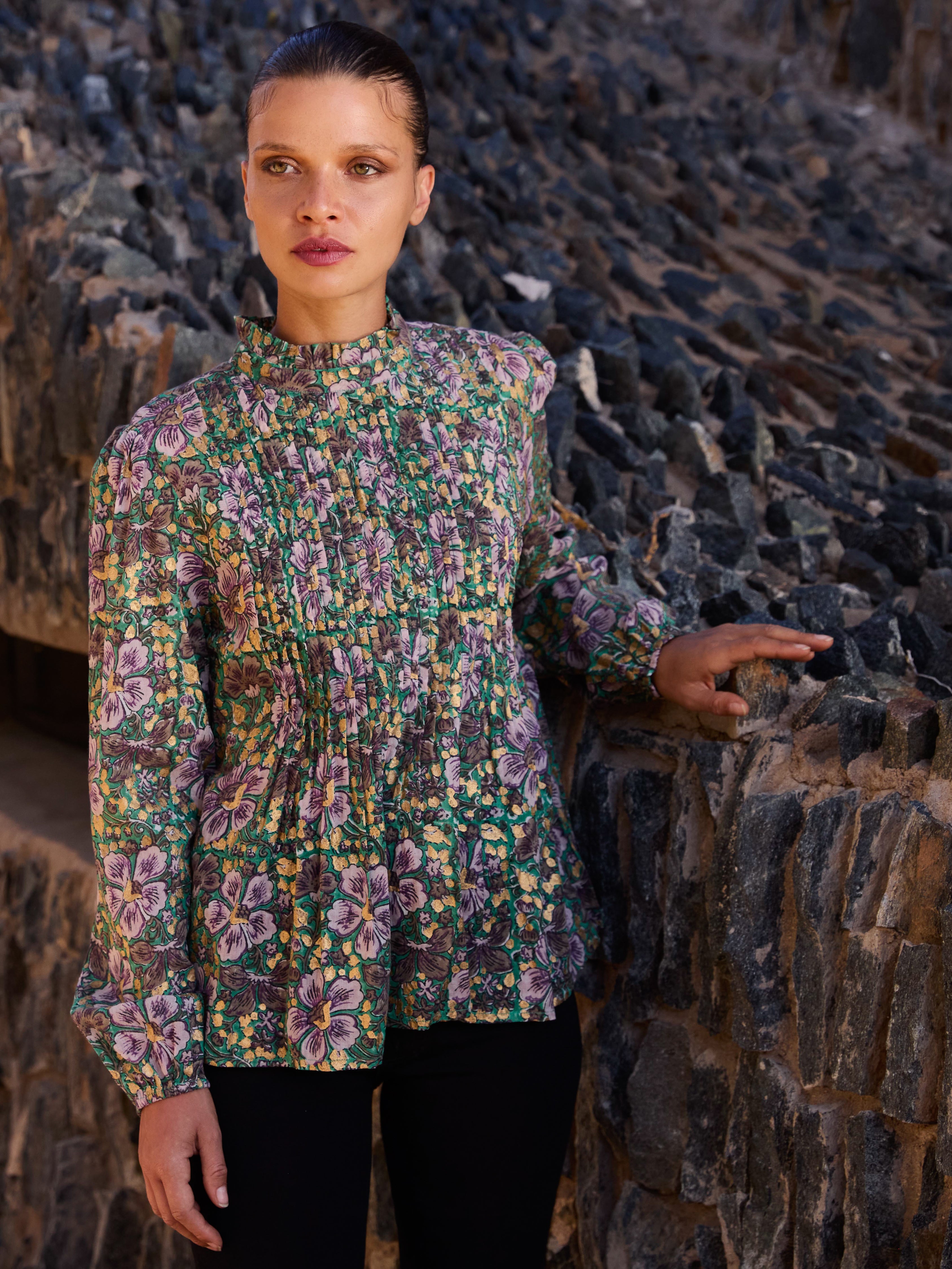 A hand-block printed garden with glints of gold. Discover our favorite floral.