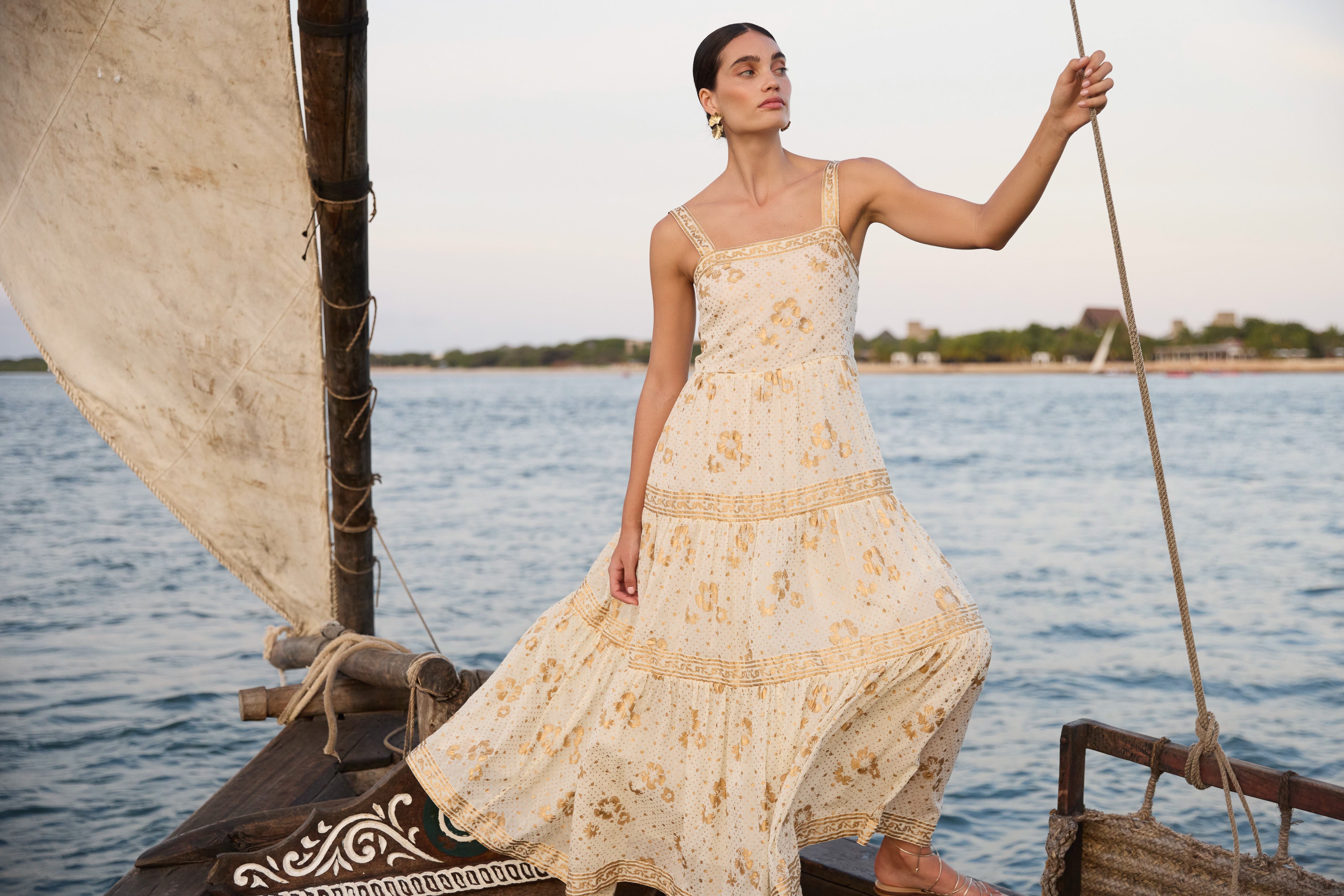 V-Neck Smocked Waist Midi- Carlin Cream Gold