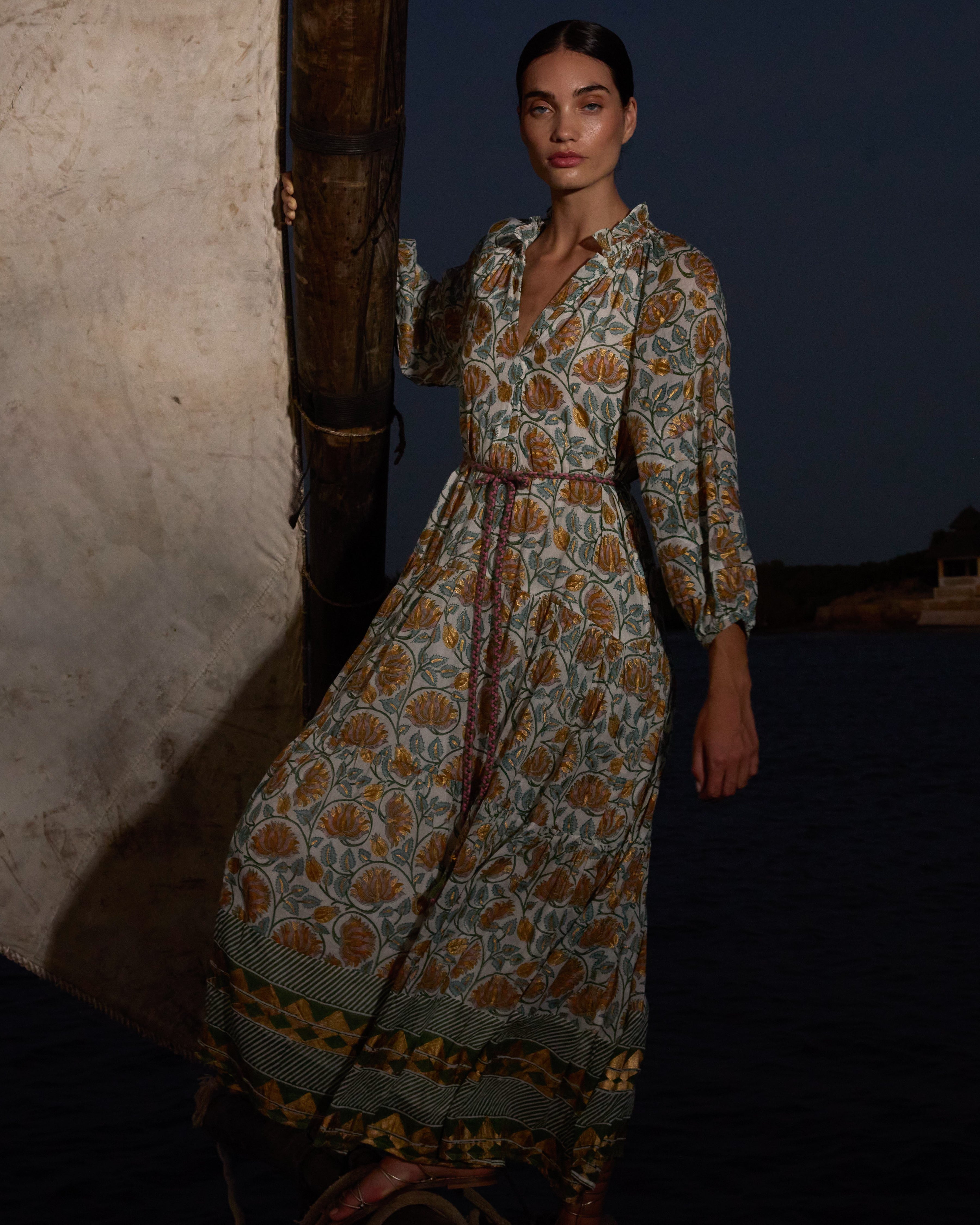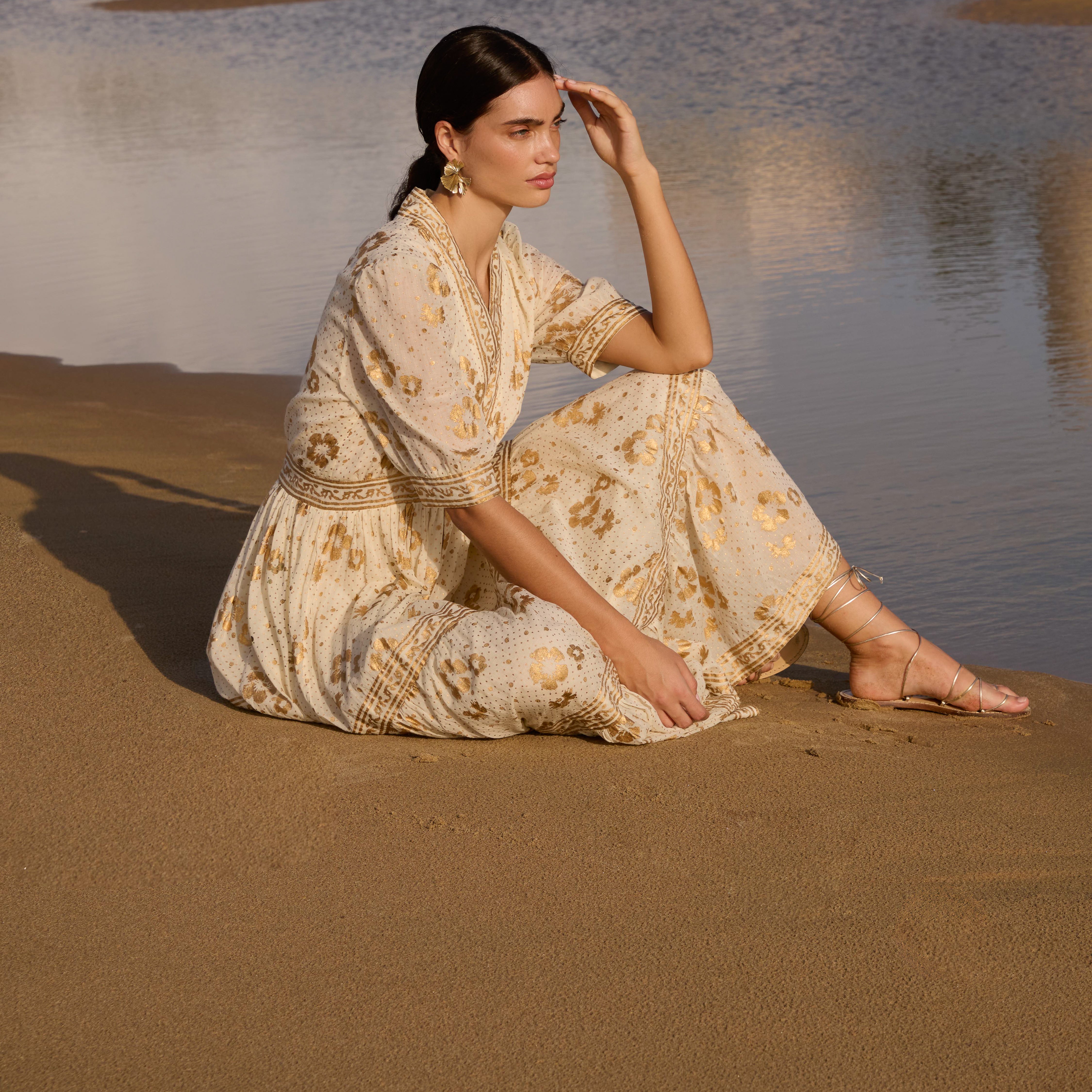 V-Neck Cuffed Maxi- Carlin Cream Gold