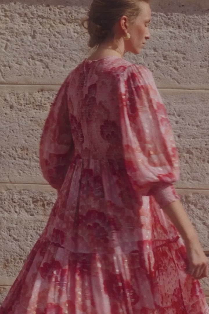 Golden metallic mini dots play with top to bottom rosy florals on delicate georgette fabric make the Smocked Top Maxi Dress a show stopping piece at every party.