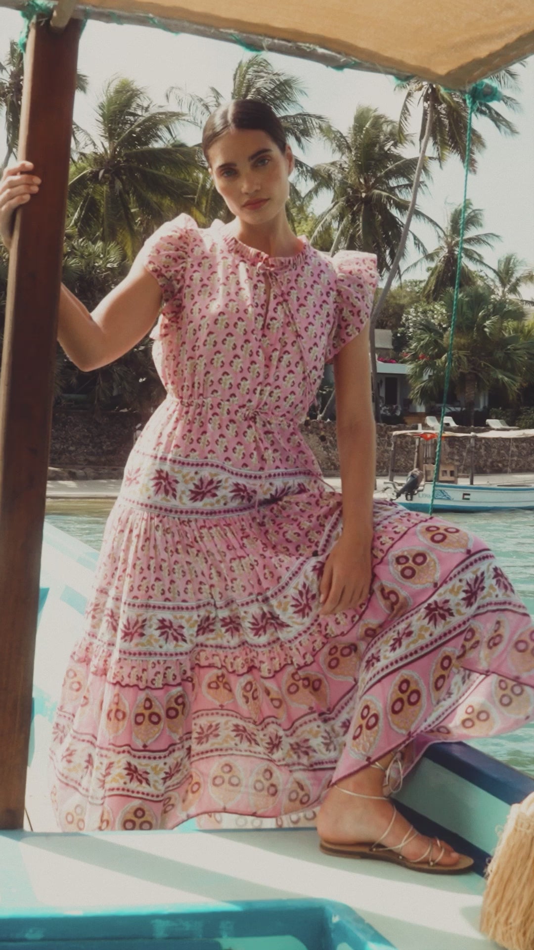 The feminine silhouette of the Cinched Flirty Midi makes this our go to day dress. Intricately hand block printed patterns play across vibrant cotton voile. while the cinching tie waist allows you to tailor your perfect fit.