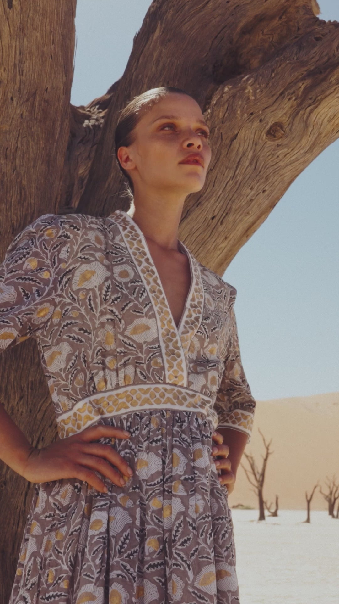 Soft botanicals hand block printed on to cotton voile fabric adorned with gilded accents throughout create a look that is sure to enchant.